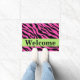 Welcome visitors to your home with this wild splash of colour of bright hot pink fushia and black zebra skin pattern door mat. This door mat is customised with the word Welcome that you can change to another word or name. A lime green strip gives an area for personalisation and additional colour. Enjoy this popular and contemporary design that will add a trendy and colourful home decorative accent. This design is available in several colour combinations in this store or can be customised for you.