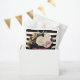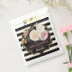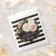 These chic and modern favour bags feature a colourful floral bouquet on the top of a black and ivory striped background and a black and gold edged bracket-shaped text area. The bouquet has lovely roses in cream, ivory, and pink, with orange Peruvian lilies and green foliage. Under the bouquet, custom text says, "Melissa's Bridal Shower" is printed in coral pink with the date of the event in sage green below, and the words, "Thank You!" in ivory below. Email niteowlstudio@gmail.com if you need any matching items or need help customising the wording.