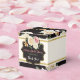 This chic and modern favour box features a colourful floral pattern with a black background and an ivory and simulated gold band around the centre with a black and gold-edged bracket-shaped text area on the front and back sides. There is also a larger bouquet with lovely roses in cream, ivory, and pink, with an orange Peruvian lily and green foliage on the front and back above the customisable text. Under the bouquet, custom text says, "Melissa's Bridal Shower" in coral pink with the date of the event in sage green below and the words, "Thank You!" in ivory at the bottom. Email niteowlstudio@gmail.com if you need any matching items or need help customising the wording.