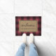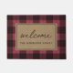 Add a farmhouse style touch to your entryway with this rustic buffalo plaid patterned doormat in red and black with tan accents. "Welcome" appears in the centre in casual handwritten script lettering; personalise with your family name beneath.