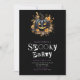 This Halloween party invitation sets a spooky and stylish tone with its black background and the words "Spooky Party" in a creepy magazine or horror cut-out font in white and purple. The font adds a chilling touch, perfect for a Halloween celebration. At the centre of the invitation is a creepy black jack-o'-lantern, surrounded by gold and grey flowers and leaves, creating a hauntingly beautiful focal point.