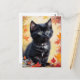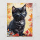 This acrylic painting artwork features a cute black kitten outdoors in the fall season, surrounded by changing leaves of red, orange, yellow. An autumncore season portrait of an adorable feline perfect for autumn or anytime, really! For fans of black cats, kittens in general, and the fall season.