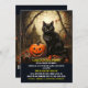 This Halloween party invitation features an illustration of a posing black cat. This festive invitation can be easily edited to display when, where and a short list of Halloween party details you can adjust to make this card one of a kind.