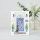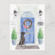 Announce your new address with our stylish announcement featuring a Black Lab, blue front door, welcome mat, slate sign, topiaries and a floral wreath set on a grey brick background.