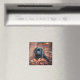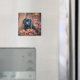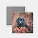 This magnet features an an adorable black Labrador retriever puppy resting in a pile of leaves.