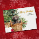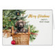 On this Holiday card, a black Labrador Retriever puppy lays in his wicker basket bed in front of a decorated Christmas tree. Also behind the basket is a pretty red holly berry and pine cone bouquet. The gold script text at the right says "MERRY CHRISTMAS", with HAPPY NEW YEAR in green below it. All the text, inside and out, may be easily changed to anything you'd like. You can see more Labrador Retriever images, as well as other breed images, at Dog Village.
