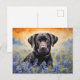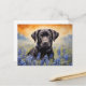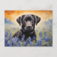 A black Labrador Retriever sits in a field of vibrant bluebonnets, its dark fur contrasting beautifully with the bright blue flowers. The dog's eyes are focused on the viewer, conveying a sense of calm and attentiveness. The background features a soft, hazy sky with warm orange and yellow hues, suggesting a peaceful sunset. Ideal gift for labrador lovers.