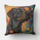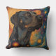 A detailed and artistic portrait of a black Labrador retriever depicted against a colourful cosmic space background with vivid red and blue hues, celestial objects like planets and stars enhancing the visual appeal.
