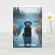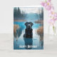 A black Labrador Retriever dog sits in the shallow water of a lake surrounded by tall reeds with a backdrop of trees and mist-covered mountains for a birthday.