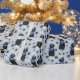 An image of a black Labrador Retriever Dog is the feature in the pattern on this all occasion gift wrapping paper. The dog wears a blue scarf and sits amid a pattern of black paw prints and white bones, and is repeated on a silver blue background.