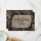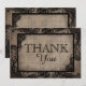 Elegant black lace over grunge rustic burlap background and monogram modern goth thank you card.