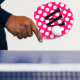 Single black letter monogram against bright pink and white polka dot pattern.