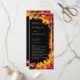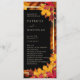 Guide your guests through your special day with our exquisite wedding program. This captivating design features a rustic backdrop of autumn leaves, complemented by a shorter, black panel adorned with a shimmering gold frame and surrounded by autumn foliage. The couple's names are prominently displayed in bold typography, followed by the wedding date and venue location.