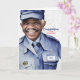 Brown skinned male postal employee with white hair is ready to offer your congratulations to the post office retiree when you personalise the card front badge on his uniform.
