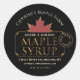 This maple syrup label can be customised with your business name, address and maple syrup volume in ounces and milliliters. There is a handy list of common container sizes with their conversions in the form field where you fill in your information. Black background with metallic gold "MAPLE SYRUP" and border. A large autumn sugar maple leaf and an editable circular logo with "Spring Season 202X" adds a special touch.