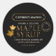 This maple syrup label can be customised with your business name, address and maple syrup volume in ounces and milliliters. There is a handy list of common container sizes with their conversions in the form field where you fill in your information. Black background with gold text and border. For a special touch, the word “maple syrup” has a gold gradient. Two sugar maple leaves and an editable circular logo with "Spring Season 202X" add a special touch.