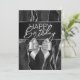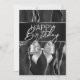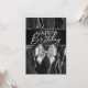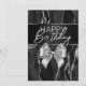 Custom birthday card with "Happy birthday" in mixed typography, silver bow, black satin ribbon, silver glitter and black marble background.