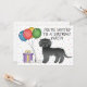 Cute birthday theme design featuring Destei's original cartoon illustration of a cute black coat colour miniature Goldendoodle breed dog. Next to the dog there are colourful birthday balloons tied on a dog bone and a purple and yellow colour present box. The background has a playful pattern of colourful pastel confetti on a white background. Personalise the sample text areas with the details of your event.