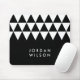 Minimalist black mouse pad featuring a modern white triangle pattern that you can personalise with your name.
