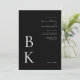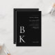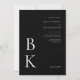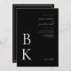 Make a dramatic and sophisticated impression with this modern black wedding invitation. Designed with a bold black background and crisp white text, this invitation highlights your monogram in a large serif font at the bottom left. The couple's names appear in an elegant white script font in the upper right along with the wedding details, creating a refined sense of balance and minimalist style.