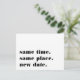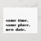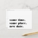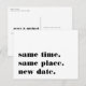 Need to postpone or reschedule your wedding? Let guests know with these modern and lighthearted postcards in white with rich black lettering. Funny and clever typography-based design features "same time, same place, new date" on front, with your new wedding date and details on the back.