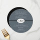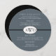 Round wedding menu template with monogram in centre. Neutral black, grey and white with four sections for appetizers, salad, entrees and dessert section in white printed text. Add three initials (wedding monogram) to the centre white oval. Reverse is black. Need other colours? Please request help, and I will gladly create it for you!