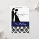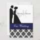 Black and white damask print with a navy blue band, a silhouette bride and groom, and areas you can personalise with your names, monogram initial, wedding ceremony and reception information on a customised wedding invitation that's classy and traditional all in one!