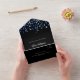A blacik background, decorated navy blue confetti. Personalise and add names, party details, RSVP date, return address and name. White text.