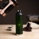 Black neon green spider web Halloween pattern Water Bottle. Drinkware with Spooky Halloween cobweb gothic design and custom black background.