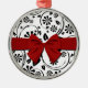 This black and white pattern features black daisy flowers on a white background and a red bow.
