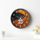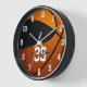 This personalised basketball wall clock features the realistic image of a basketball that has two recolored panels--one black and one orange--with overlying clock face numerals - personalise with player name in an "autograph" style font overlying the athlete's jersey number - by katz_d_zynes
