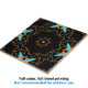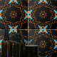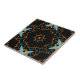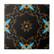 This ceramic tile features a symmetrical pattern that is both complex and visually striking. The background colour is black which provides a stark contrast to the vibrant motifs adorning the surface. The design is composed of intricate floral motifs in vibrant shades of orange and blue, outlined with delicate golden lines. These motifs are symmetrically arranged, creating a harmonious balance that is pleasing to the eye. At the centre of the tile is a star-shaped figure, surrounded by larger floral designs at each corner. Small blue dots are scattered throughout the design, adding depth and complexity to the overall pattern.