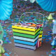 Stripes of all colours of a rainbow including pink, red, gold, orange, ecru, yellow, lime green, green, pastel blue, turquoise, blue grey, indigo, lavender, and purple outlined in black.