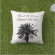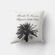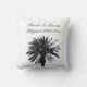 Black and white palm tree outdoor beach wedding pillows. Classy script typography template with exotic palm tree leaves. Black and white design for outside summer wedding venue. Part of large matching collection suite with personalised decorations and luxurious stationery items. Personalise with names of bride and groom. Double sided print.