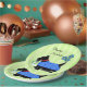 Enjoy a party, meeting or other event with these fun and whimsical "Party Scottie" disposable paper plates. Customise with other words, a birthday or other event or celebration, or personalise with your dog's name. Your dog love will shine with these unique one of a kind paper plates with a cute black terrier dog dressed for the occasion. This whimsical black Scottie Terrier is wearing a blue sweater coat with tonal blue stars and a red collar. A lime green and turquoise ball is behind the Scottie and a large white dog bone is at his or her front paw. The background is a lime green tonal stripe pattern to make a stylish, trendy and custom decorative disposable paper party plates. Three turquoise teal blue flowers are above the dog. This cute, cuddly and trendy dog is original art by Phyllis Dobbs and will melt the heart of a dog lover. This Scottie is one of a series of 6 Scotties and all are fully customisable to make it your own! Coordinate with matching products.