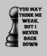 This bold chess design features a black pawn with the phrase “You may think me weak but I never back down.” Perfect for chess lovers and players who admire resilience, courage, and the underestimated power of the pawn.