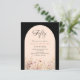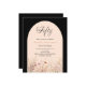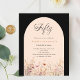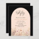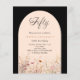 An elegant wildflower invitation. Black background and a peach coloured arch. Decorated with watercolored wildflowers in beige, pink.