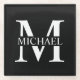 featuring personalised white monogram in classic serif font style with box of name in the middle of monogram on black background.