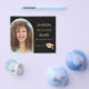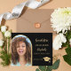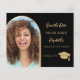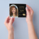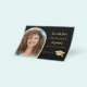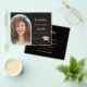 On front: Add your own vertical size photo of the graduate. A faux gold photo arch frame. A classic black background, golden text. Templates for a name and date. The name and the text: Save the Date are written with a modern hand lettered style script. With a cap, tassel topper.