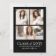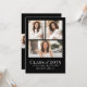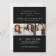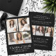 A simple and elegant graduation announcement designed with a bold black background and crisp white fonts for a striking, modern look. Both the front and back feature photo collages that keep the design polished and timeless. The front showcases three photos arranged in a clean collage layout, framed by a subtle white border. “Class of 2026” (or any year), the graduate’s name, and school are displayed in simple, modern white fonts that stand out beautifully against the black background.