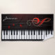 Modern black piano with white keyboard and gradient red notes and treble clef. Optional monogram