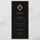 Above the text, there is a monogram in a vintage faux rose gold crest. The title "Menu" and the subtitles are written in caps. All text can be personalised and has a pink colour similar to the rose gold crest. The background is black. On the back, there is the same monogram in crest. The monogram is formed by the two initials separated by a thin line.