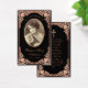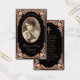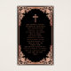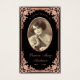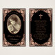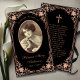 A memorial prayer card with a vintage air for a funeral. On both sides, it is black and it has an elegant baroque vintage (faux) rose gold frame. On the front, there is a vintage oval photo with rose gold border and pink text above and under it. The words "in loving memory" are arched above the photo. The name is written under it in an elegant calligraphic script. On the back there is a prayer, in pink caps, with a rose gold cross above it.