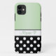 Custom iPhone 5 case personalised with your name, and designed with white polka dots over black, and a gradient green.