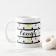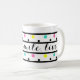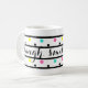 Pretty mug with Laugh Smile Live quote written in black script. Geometric shapes with black stripes. Bright and colourful pink, yellow, turquoise blue and black polka dots are dancing for a fresh modern look. Fresh trendy polka dots for the spring and summer kitchen dinnerware. Original design © TamiraZDesigns. www.zazzle.com/tamirazdesigns