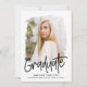 Trendy graduation party invitations featuring the graduate's photo inside of a textured mask frame with "Graduate" in a black handwritten script. Personalize the front of the photo graduation party invites by adding the graduate's name, school name, and graduation year. The invite reverses to display your graduation party details with a black and white striped pattern.