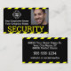 This business card features a professional design with a "SECURITY" title printed in bright yellow across the bottom portion over a black background. A sample security guard photo is placed on the right which you can personalise to include your own photo ID. A sample company or business logo is placed on the left, followed by an employee and company name. The security company or firm information and contact info is placed on the back. A bright yellow and black striped caution strip borders the top and bottom portions.