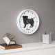 Destei's original cartoon illustration of an adorable black coat colour Pug breed dog. The dog is standing and looking towards the viewer. The tail is curled on the top of the dog's back. The dog's mouth is closed and the eye colour is brown. The clock face is made of simple modern lines. There is also a personalizable text area for a name or other custom text.