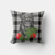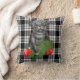 Black and white plaid background with an adorable black pug puppy sitting by a pine branch with a red tree ornament. A perfect holiday gift for the Pug lover or to brighten up your dog loving holiday