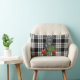 Black and white plaid background with an adorable black pug puppy sitting by a pine branch with a red tree ornament. A perfect holiday gift for the Pug lover or to brighten up your dog loving holiday